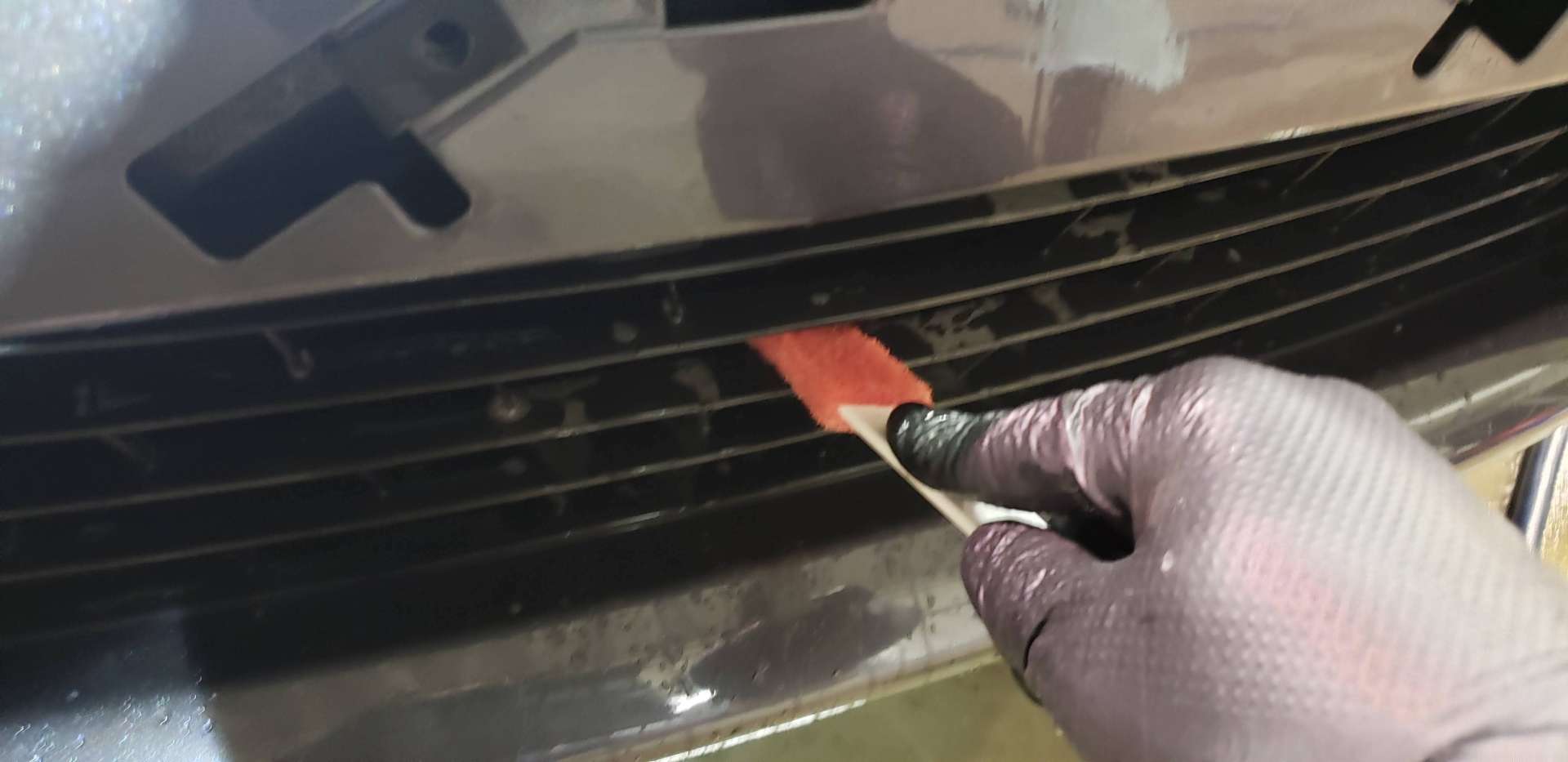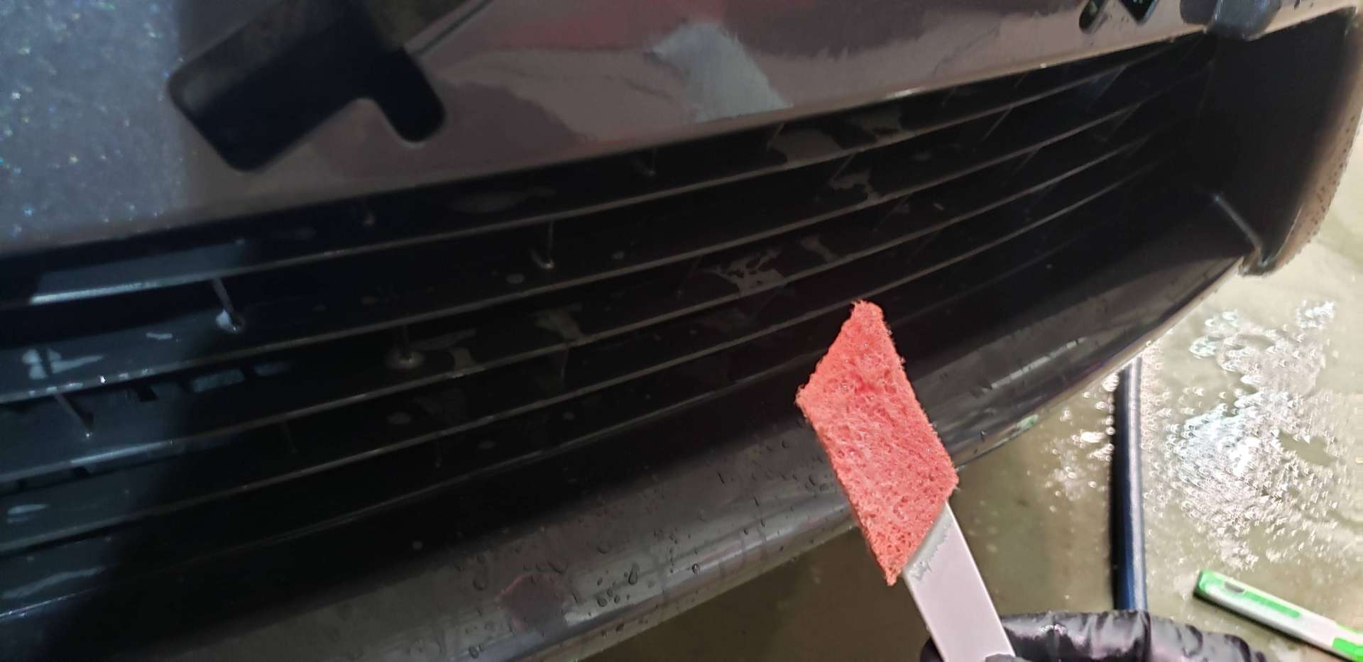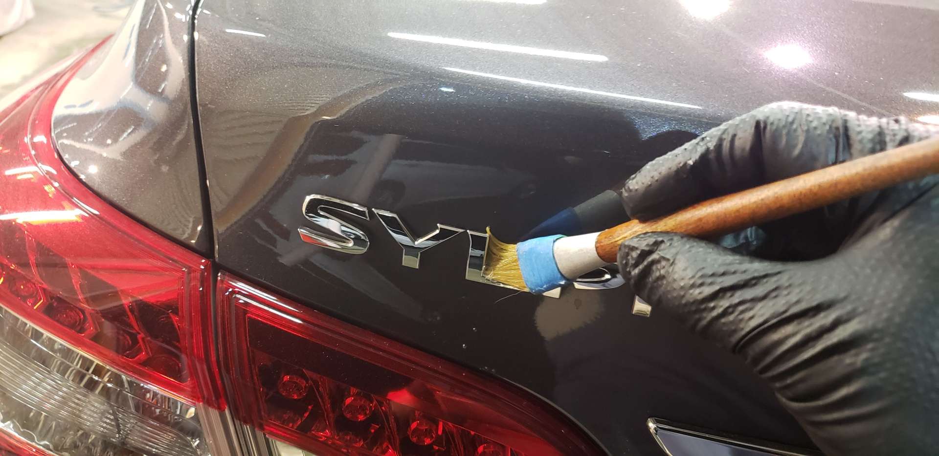 特殊洗剤で頑固なエンブレム付近の汚れを除去