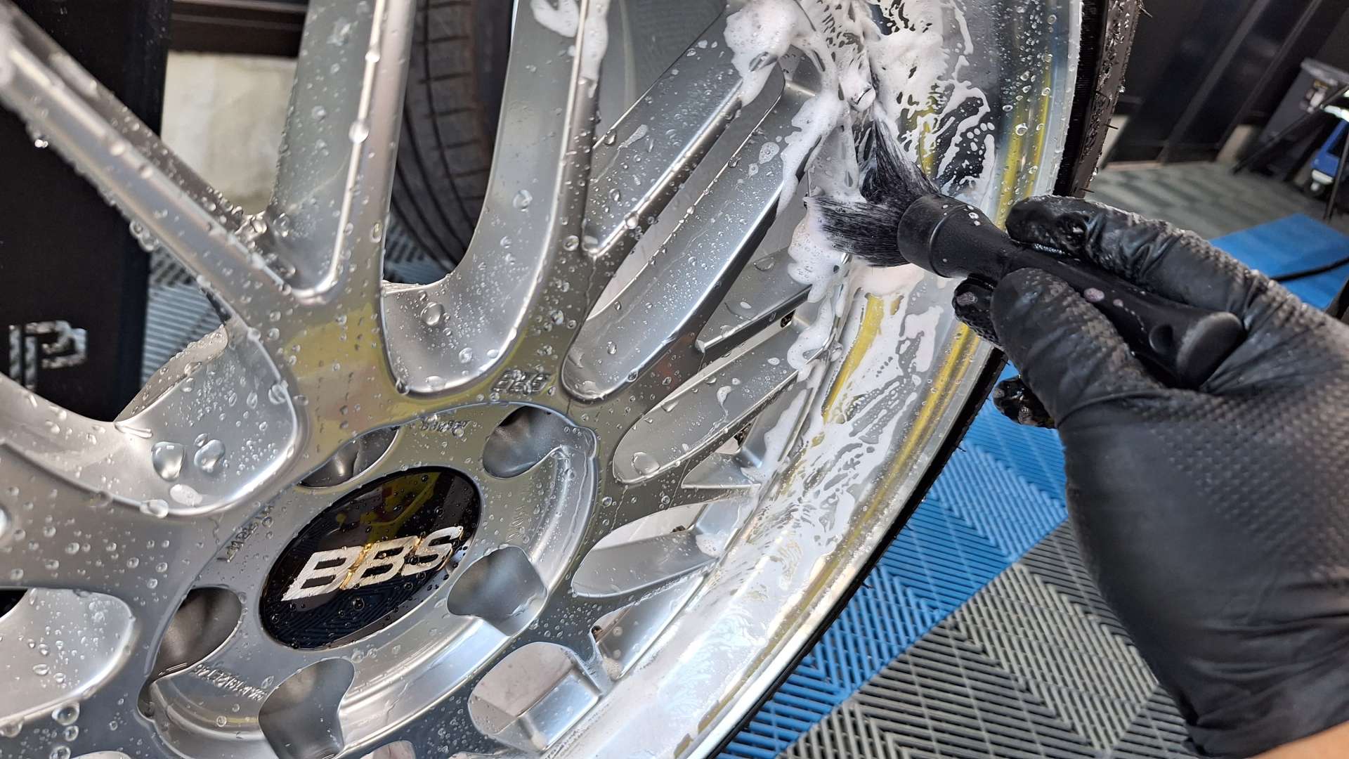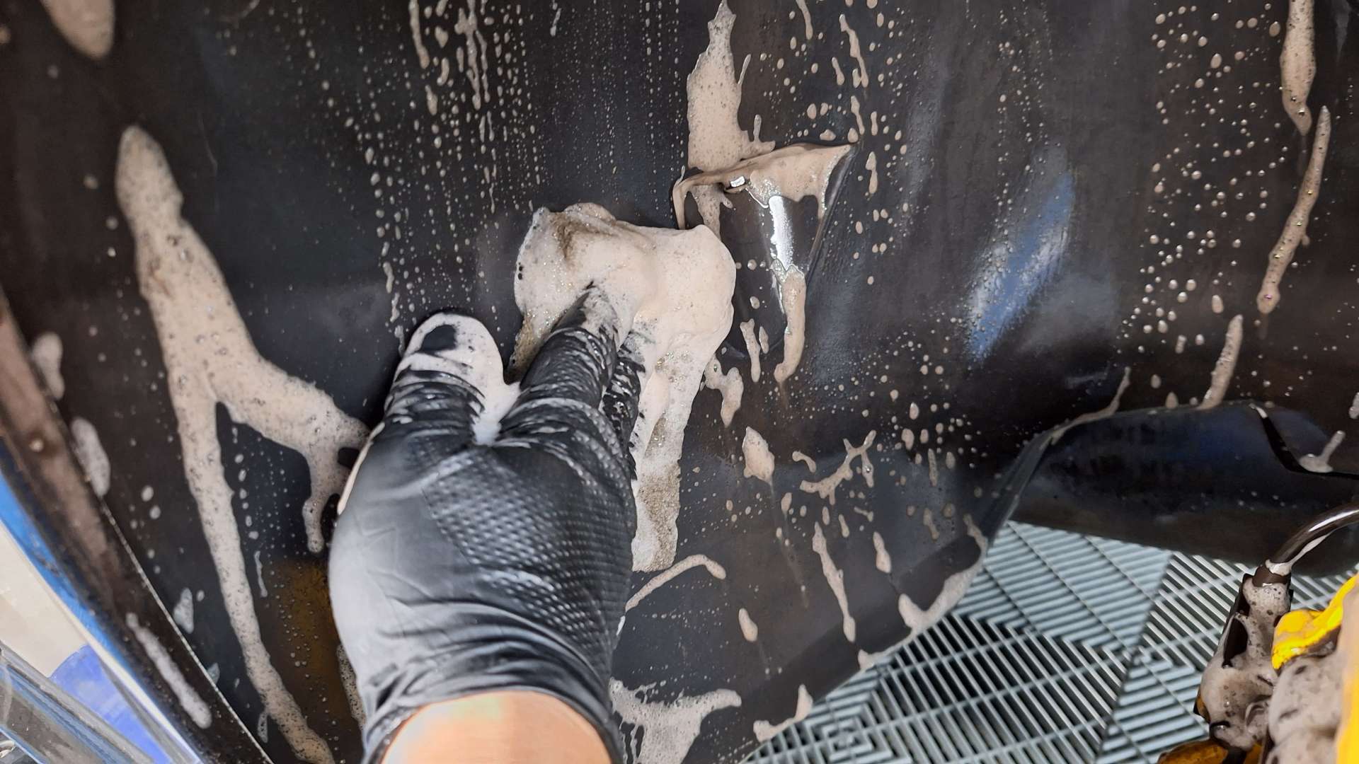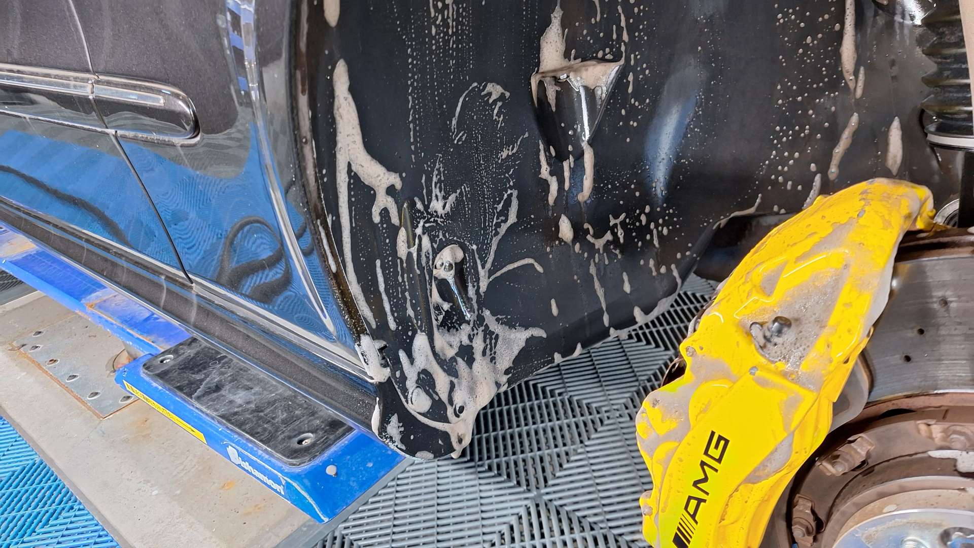タイヤハウス内も特殊洗剤で洗っていきます!