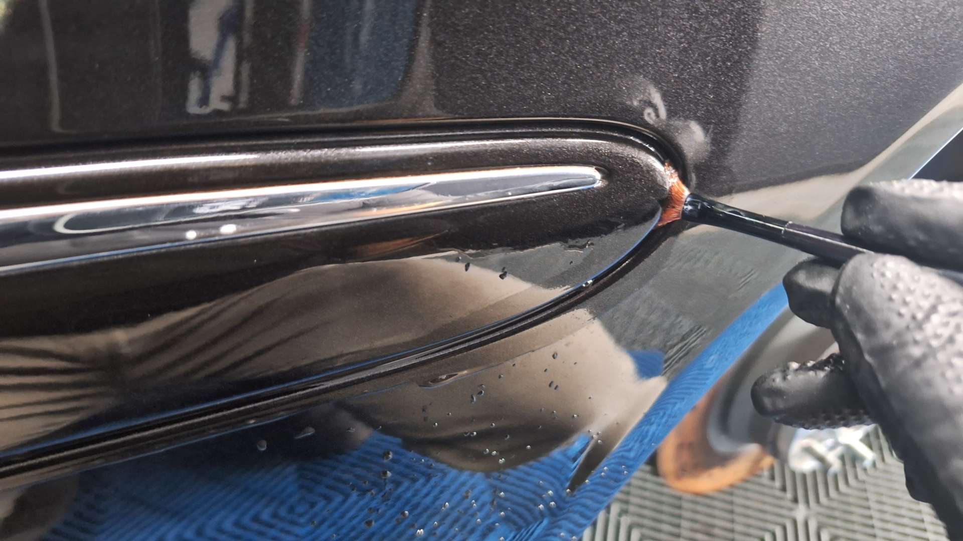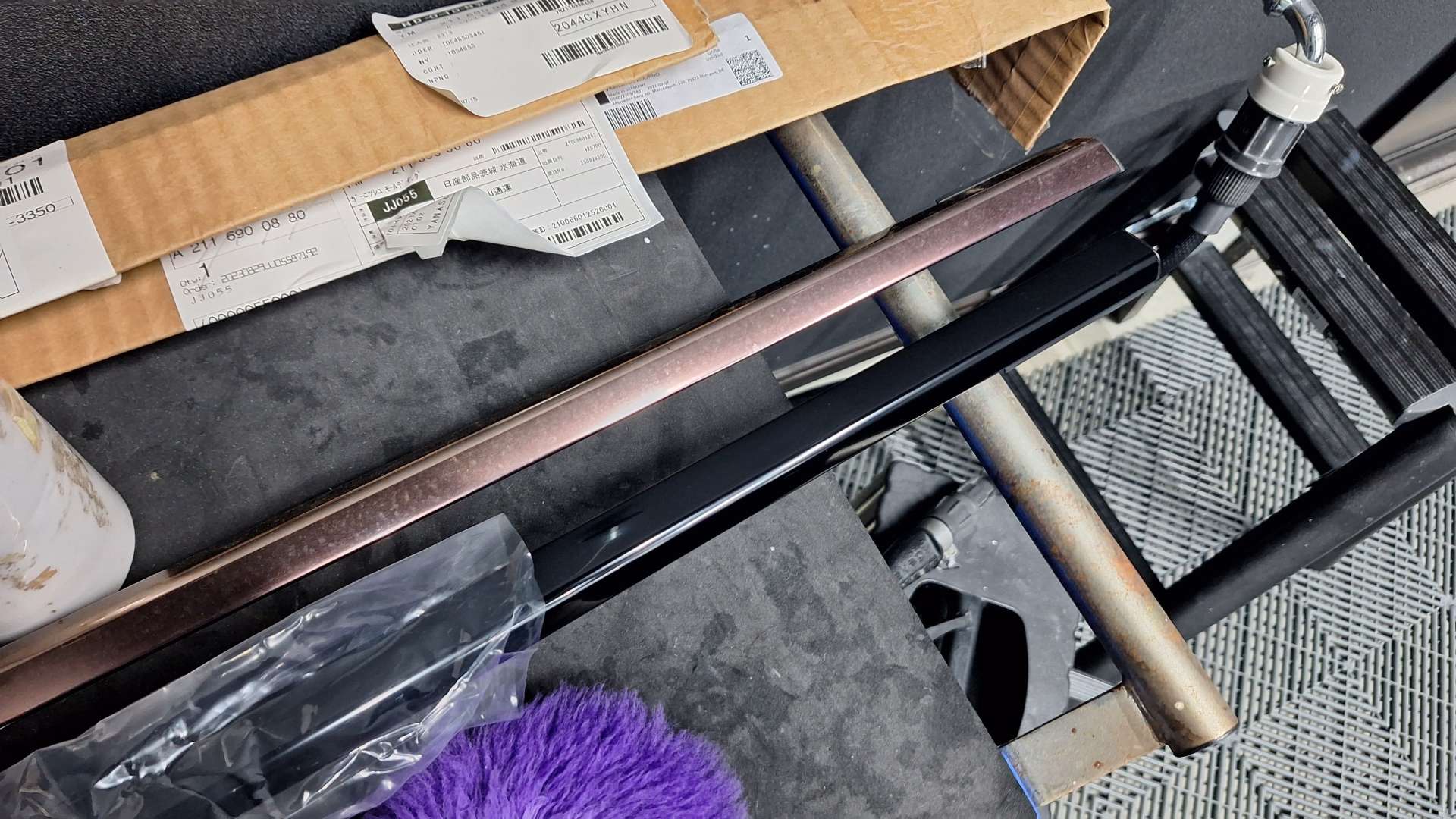 ちょっとわかりずらいですがブラックの通称アルマイトメッキモールの交換もご依頼頂き交換します。