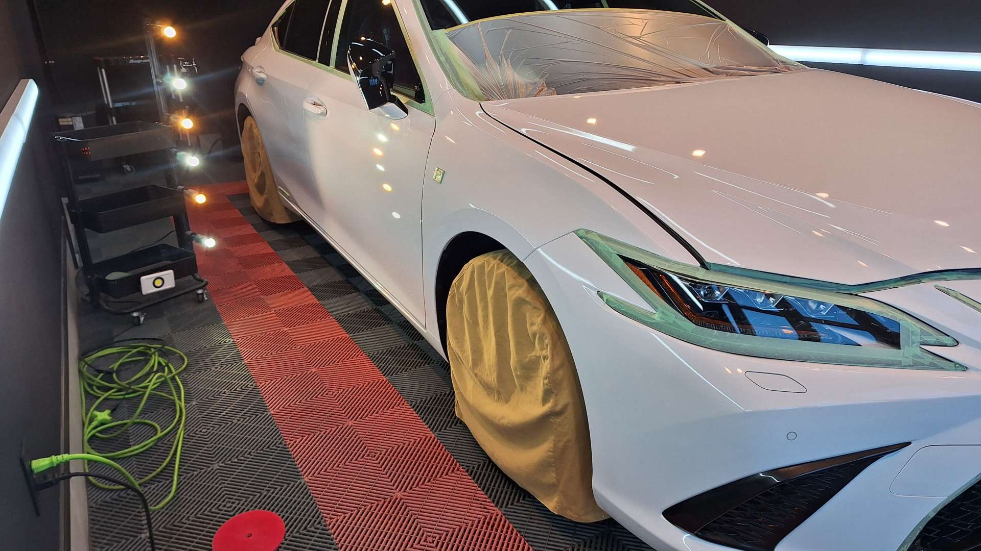 白い車あるあるの細部の汚れを丁寧に除去後にフルマスキングから研磨