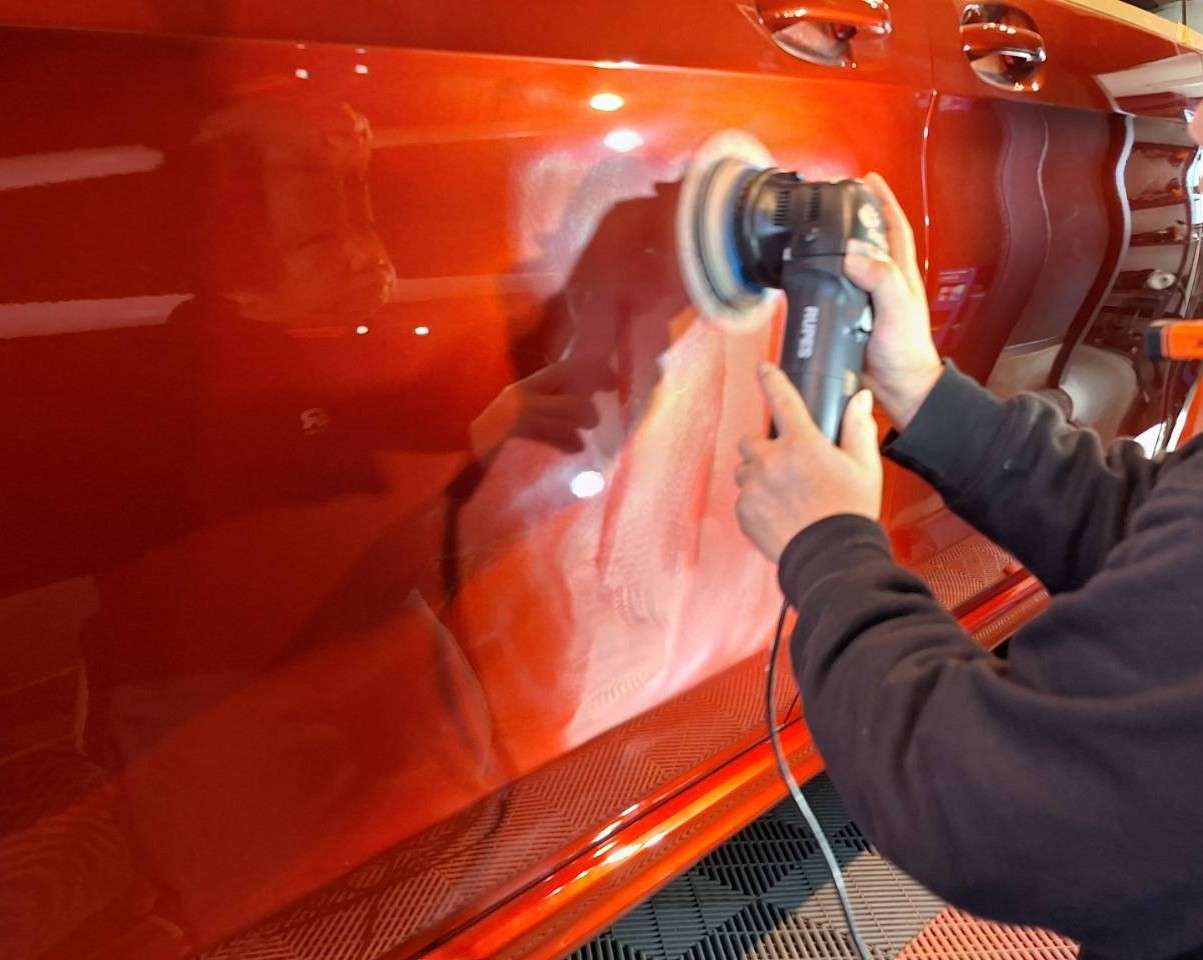当店では、下の写真のようにしっかりとマスキング作業をしたのちにポリッシャーを使い磨いていきます。