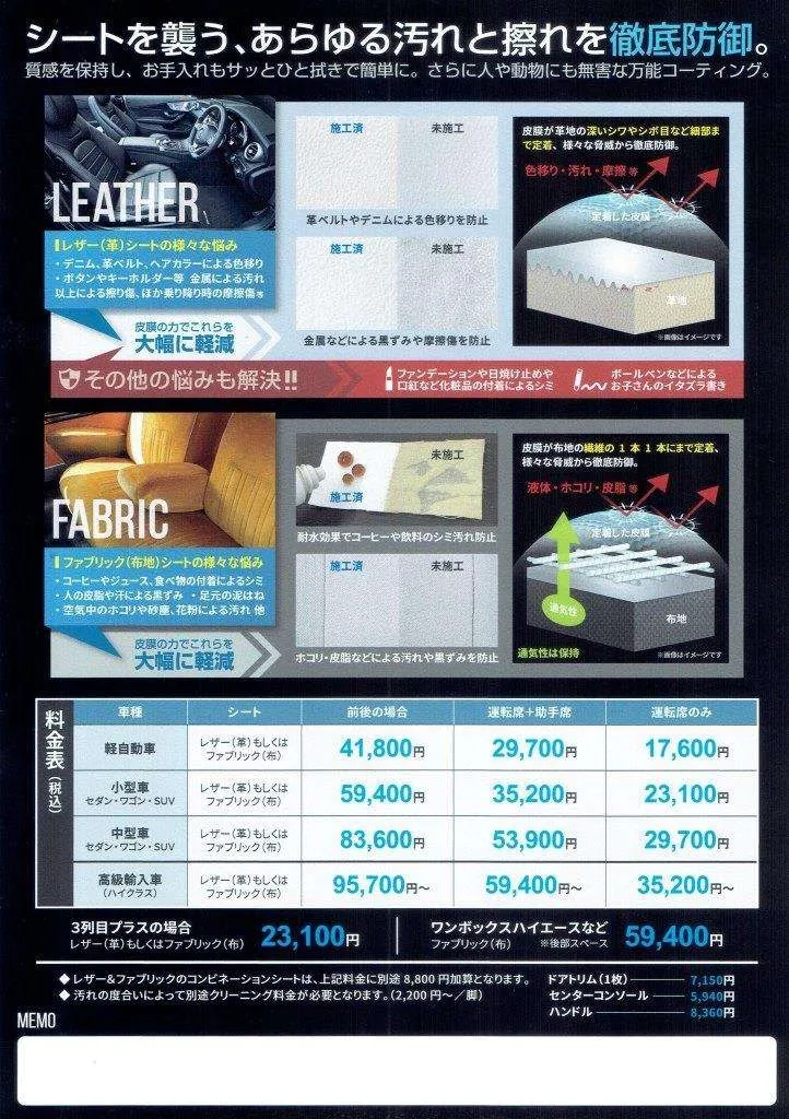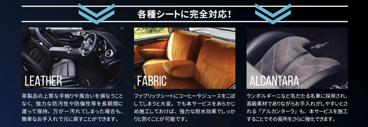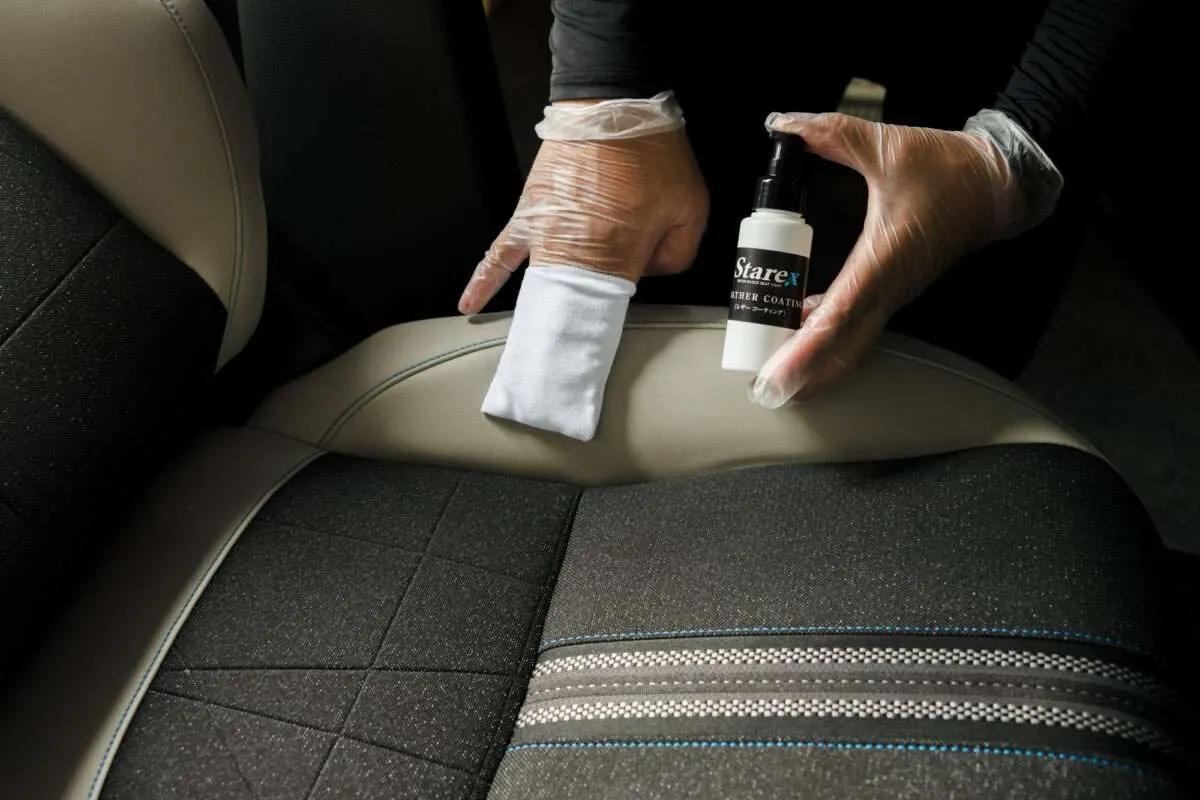 防汚や防水、防傷といった作用を付与する水性のシートコーティング剤であるスタレックスを使用しております。表面を保護することで、衣服等からの色移りや金属等が擦れた際の傷のリスクを軽減し、日常的なメンテナンスの手間を抑えます。また、水に樹脂を溶かし込んだ水性コーティングであることから高い安全性を備えており、お子様やペットがご利用になるお車にも施工可能です。